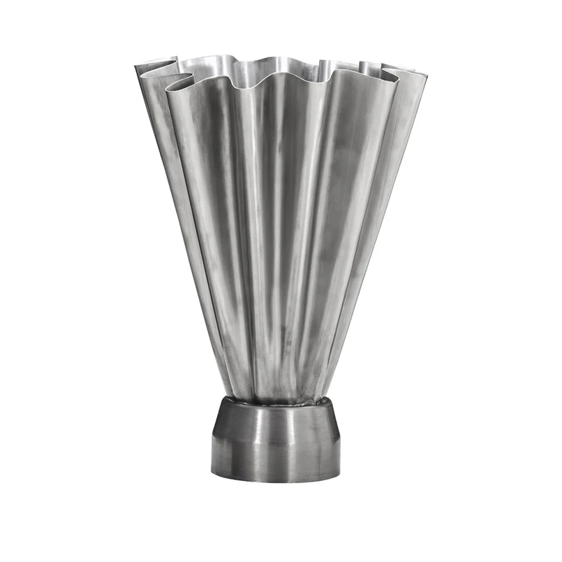 Táto ručne vyrobená železná váza s brúseným strieborným povrchom vnesie do každého domova moderný lesk a umeleckú rafinovanosť. Vlnitý tvar štýlovo zdôrazňuje kvety a premení vázu na umelecký objekt na stôl, kredenc alebo parapet. Či už s jednotlivými vetvičkami alebo bohatými kyticami – vázu Flood ľahko upúta pozornosť a dodá miestnosti individualitu. Ak sa vzdáte kvetinovej výzdoby, vázu Flood môžete použiť aj ako samostatný dekoratívny prvok.