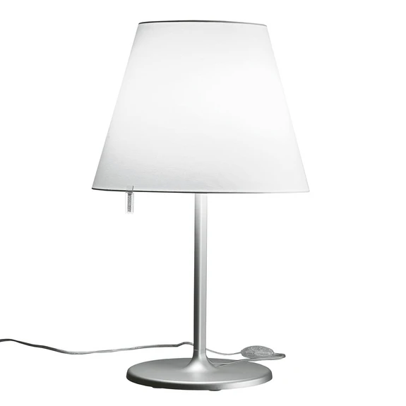 Keď si stolnú lampu Melampo T v sivej farbe prezriete zblízka, všimnete si pozornosť venovanú detailom v konštrukcii. Tienidlo sa dá nakloniť a inak klasické línie sú rozbité zárezom v tienidle, ktorý umožňuje rovnaký uhol.