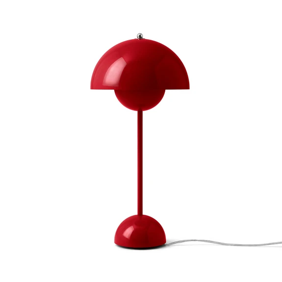 Stolová lampa Flowerpot VP3 v červenej farbe je súčasťou pôsobivej série Flowerpot, ktorú po prvýkrát predstavil v roku 1968 priekopnícky dánsky dizajnér Verner Panton, inšpirovaný revolúciou Flower Power v 60. a 70. rokoch. Od 60. rokov sa séria Flowerpot výrazne rozrástla a dnes pozostáva z rôznych stolových lámp s kovovou základňou aj bez nej, závesných svietidiel v rôznych veľkostiach, nástenných svietidiel a prenosných stolových lámp, ktoré sa všetky vyznačujú jedinečným a nezameniteľným tienidlom na lampu. Tienidlo na lampu pozostáva z dvoch protiľahlých kruhov, pričom priemer hornej gule je presne dvojnásobok priemeru spodnej gule, čím sú dokonale vyvážené.