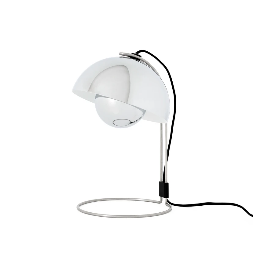Chromovaná stolová lampa Flowerpot VP4 je súčasťou pôsobivej série Flowerpot, ktorú po prvýkrát predstavil v roku 1968 priekopnícky dánsky dizajnér Verner Panton, inšpirovaný revolúciou Flower Power v 60. a 70. rokoch. Od 60. rokov sa séria Flowerpot výrazne rozrástla a dnes pozostáva z rôznych stolových lámp s kovovou základňou aj bez nej, závesných svietidiel v rôznych veľkostiach, nástenných svietidiel a prenosných stolových lámp, ktoré sa všetky vyznačujú jedinečným a nezameniteľným tienidlom na lampu. Tienidlo na lampu pozostáva z dvoch protiľahlých kruhov, pričom priemer hornej gule je presne dvojnásobok priemeru spodnej gule, čím sú dokonale vyvážené.